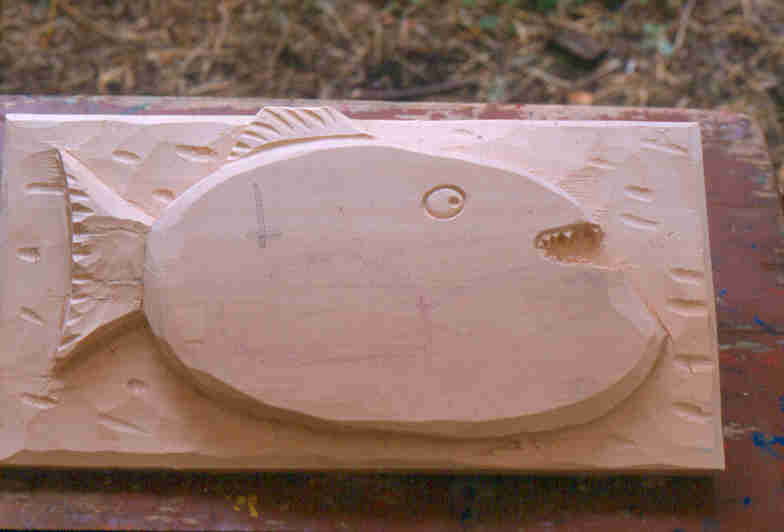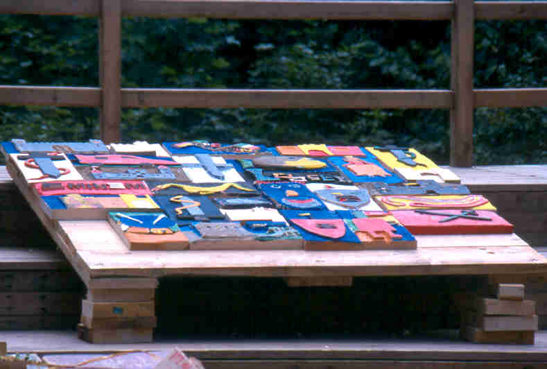 Ankunft am Montagmorgen um 9 Uhr auf der Burg. Danach besichtigte ich die Arbeitsplätze und bereitete sie noch soweit vor, dass wir baldmöglichst beginnen konnten. Das Thema war ein großes gemeinsames Wappen. Vorarbeiten wie Holz, Arbeitsplätze sowie Werkzeug wurden nach vorherigen Anweisungen von mir von den Helfern des Jugendbüros gerichtet und vorbereitet. Um 10 Uhr kamen die Kinder auf die Burg, zu Fuß aus der Stadt, was einen tüchtigen Marsch von 45 Minuten bedeutete. Zuerst wurden ihnen die Benimmregeln erklärt und wer sich nicht daran hielt musste die Burg verlassen und nach Hause gehen. Die Kinder, 32 an der Zahl wurden in zwei Gruppen aufgeteilt. Eine Gruppe kam zu mir zum Schnitzen, die andere Gruppe zu einer Töpferin. Damit man mit einer solch großen Anzahl von Kindern vernünftig arbeiten konnte, waren bei jeder Gruppe noch 2 Erzieherinnen