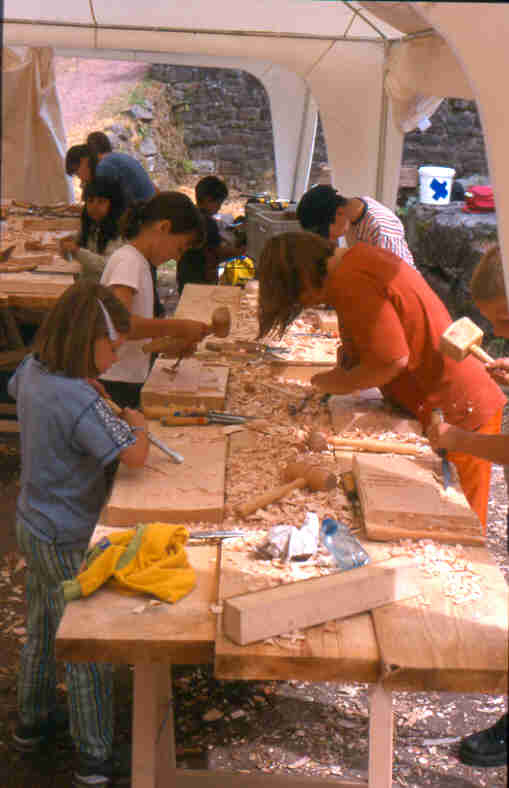 Die Kinder waren im Alter zwischen 6 und 12 Jahren, wobei die 6 – jährigen noch recht klein waren, doch muss man anerkennend sagen, dass diese teils besser als die älteren Kinder durchhielten. Wir hatten eine relativ freie Themenwahl, das heißt es soll etwas mit Rittern, Wappen oder der Burg zu tun haben. Und alle Teile sollen zum Schluss zu einem großen Ganzen zusammengefügt werden. Jetzt konnten die Holzstücke (gleichgroße Lindenholzstücke) an die 16 Kinder verteilt werden. Zuerst musste ich erklären, worum es überhaupt ging. Jedes Kind sollte sich zunächst ein Motiv ausdenken und auf das Werkstück aufzeichnen. Nachdem alle ihr Motiv auf dem Holz hatten (sie mussten darauf achten, dass die Zeichnungen nicht zu kleinlich wurden), durften die Kinder ihre Werkstücke mit meiner Hilfe befestigen. Zum Mittagsessen gingen alle Kinder und Erwachsenen in ein Zelt. Nach der Mittagspause und einer Tasse Kaffe warteten die Kinder ungeduldig auf das Beginnen mit den Schnitzmessern. Als Schnitzmesser dienten Stechbeitel, welche von einer Schule ausgeliehen wurden. Wir holten die Schnitzmesser aus einem Bauwagen und nach einer „Belehrung“ verteilte ich die Messer. Nach dieser Einweisung durften die Kinder mit dem Schnitzen beginnen. Mit kräftigen Schlägen und zum Teil, wie sich herausstellte, mit wenig Geduld, ging es zur Sache. Erfahrungen mit Holz und Zeit, Kraft und Händeweh wurden am Nachmittag reichlich gemacht. Manche brauchten öfters Hilfe oder Abwechslung, wobei mir die beiden Erzieherinnen zur Seite standen. Um 16 Uhr 15 räumten wir auf. Es gab noch ein gemeinsames Spiel und danach liefen die Kinder in die Stadt zurück.